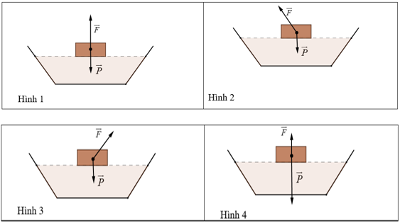 Question 53. Một vật được thả nổi hoàn toàn trong một cốc chất lỏng. Cách biểu diễn lực đẩy Archimedes $\vec{F}$ và trọng lực $\vec{P}$ tác động lên vật ở hình dưới đây hình nào đúng?