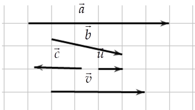 Question 6. Cho các vecto $\vec{a},\vec{b},\vec{c},\vec{u}$ và $\vec{v}$ như trong hình bên. Hỏi có bao nhiêu vectơ cùng hướng với vectơ $\vec{u}$?