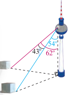 Câu 20. Một người đứng ở trên một tháp truyền hình cao 352 m so với mặt đất, muốn xác định khoảng cách giữa hai cột mốc trên mặt đất bên dưới. Người đó quan sát thấy góc được tạo bởi hai đường ngắm tới hai mốc này là $43^\circ$, góc giữa phương thẳng đứng và đường ngắm tới một điểm mốc trên mặt đất là $62^\circ$ và đến điểm mốc khác là $54^\circ$ (Hình). Tính khoảng cách giữa hai cột mốc này. (kết quả làm tròn đến hàng đơn vị)