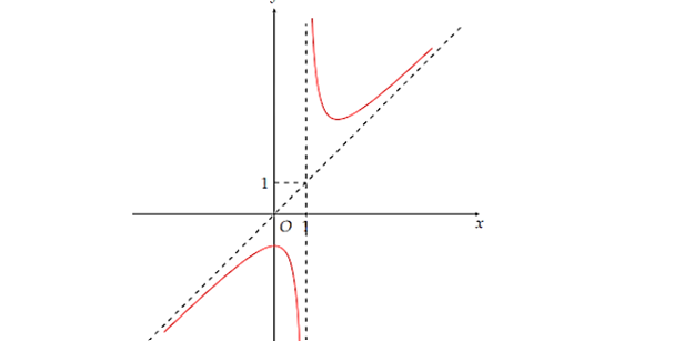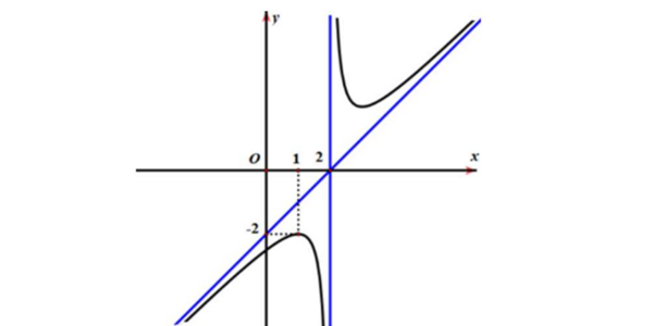 Question 32. (Sở Hà Tĩnh 2025) Cho hàm số $y=\dfrac{ax^2+bx+c}{x}, (ac \ne 0)$ có đồ thị như hình vẽ. Đường tiệm cận xiên của đồ thị hàm số đã cho là đường thẳng có phương trình