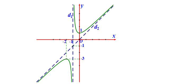 Question 45. (Cụm trường THPT Hải Dương 2025) Cho hàm số $y=\dfrac{x^2+bx+c}{x+n}$ có đồ thị và hai đường tiệm cận $d_1, d_2$ như hình vẽ dưới đây.