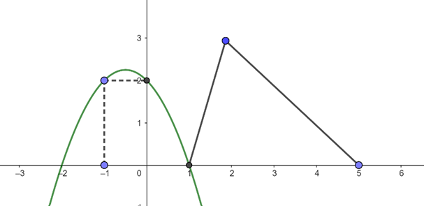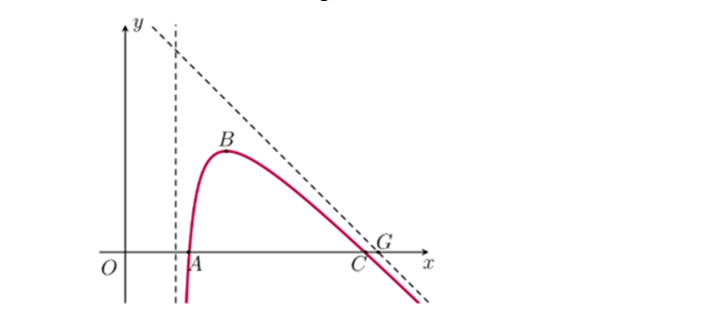 Question 11. (Sở Hà Tĩnh 2025) Một máy bay trình diễn có đường bay gắn với hệ trục $Oxy$ được mô phỏng như hình vẽ, trục $Ox$ gắn với mặt đất. Đường bay có dạng là một phần của đồ thị hàm phân thức bậc hai trên bậc nhất $y = f(x)$ có đường tiệm cận đứng là $x = 2$. Điểm $G$ là giao điểm của đường tiệm cận xiên của đồ thị hàm số $y = f(x)$ và trục $Ox$ được gọi là điểm giới hạn. Biết máy bay bay từ vị trí $A$ cách tọa tọa độ $O$ một khoảng 2,5 đơn vị và máy bay khi ở vị trí cao nhất cách điểm xuất phát 1,5 đơn vị theo phương song song với trục $Ox$ và cách mặt đất 4,5 đơn vị. Vị trí máy bay tiếp đất cách điểm giới hạn một khoảng bằng bao nhiêu?