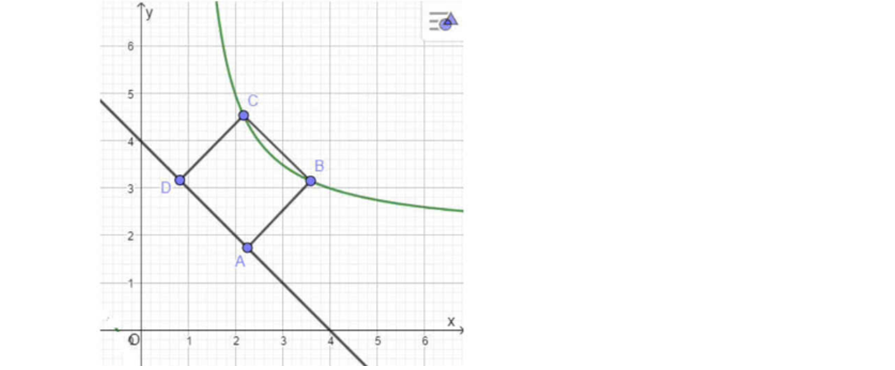 Question 13. (Chuyên Hạ Long 2025) Trong một công viên có một hồ nước và một đường đi lát gạch hoa. Thiết lập hệ trục $Oxy$ như hình vẽ dưới, kiến trúc sư thấy rằng bờ hồ có thể coi như một nhánh của đồ thị hàm số $y = \dfrac{2x+1}{x-1}$ và đường đi khi đó ứng với đường thẳng $(d): y = -x+4$. Để đảm bảo ánh sáng, kiến trúc sư muốn đặt 2 cột đèn trên bờ hồ và 2 cột đèn trên đường đi sao cho 4 cột đèn này tạo thành một hình vuông. Tính khoảng cách giữa hai cột đèn trên bờ hồ (làm tròn đến hàng phần trăm).