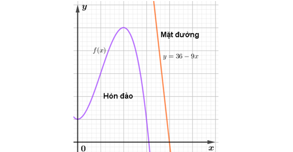 Question 20. (THPT Trực Ninh - Nam Định 2025) Một hòn đảo nằm trong một hồ nước. Biết rằng đường cong tạo nên hòn đảo được mô hình hóa vào hệ trục tọa độ $Oxy$ là một phần của đồ thị hàm số bậc ba $f(x)$. Vị trí điểm cực đại là $(2;5)$ với đơn vị của hệ trục là 100m và vị trí điểm cực tiểu là $(0;1)$. Mặt đường chạy trên một đường thẳng có phương trình $y = 36-9x$. Người ta muốn làm một cây cầu có dạng một đoạn thẳng nối từ hòn đảo ra mặt đường. Độ dài ngắn nhất của cây cầu bằng bao nhiêu mét? (làm tròn đến hàng phần chục)