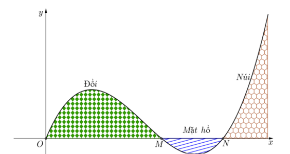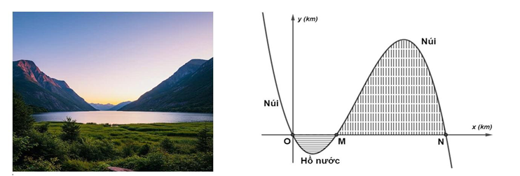 Question 27. (THPT Ngô Sĩ Liên - Bắc Giang 2025) Lát cắt của một vùng đất được mô hình hóa bởi hàm bậc ba $y = f(x)$ có đồ thị như hình vẽ dưới (đơn vị trên các trục là km). Biết khoảng cách $OM = 2\text{km}$; độ rộng của núi $MN = 3,5\text{km}$. Độ sâu của hồ nước là 450m. Chiều cao của ngọn núi là bao nhiêu mét? (làm tròn đến hàng đơn vị).