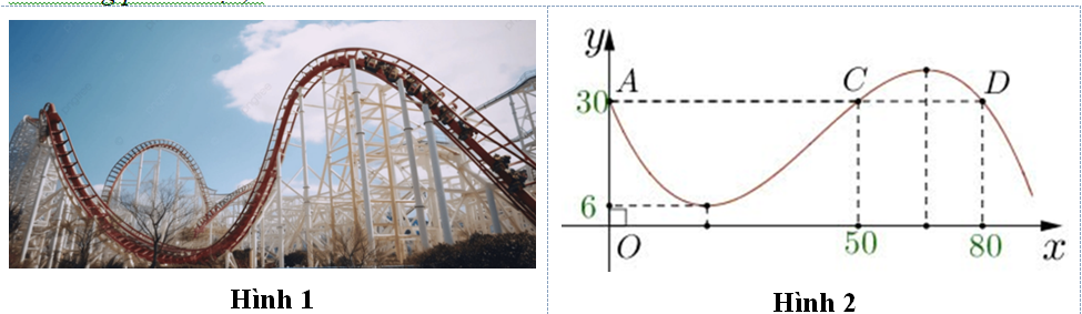Question 38. (THPT Lê Quý Đôn - Hà Nội 2025) Một phần đường chạy của tàu lượn siêu tốc (hình 1) khi gắn hệ trục toạ độ $Oxy$ được mô phỏng ở hình 2, đơn vị trên mỗi trục là mét. Biết đường chạy của nó là một phần đồ thị hàm bậc ba $y=ax^3+bx^2+cx+d(0 \le x < 90)$; tàu lượn siêu tốc xuất phát từ điểm $A$, đi qua các điểm $C,D$ đồng thời đạt độ cao nhỏ nhất so với mặt đất là 6m. Độ cao lớn nhất mà tàu lượn siêu tốc đạt được là bao nhiêu mét so với mặt đất? (Kết quả làm tròn đến hàng phần chục).