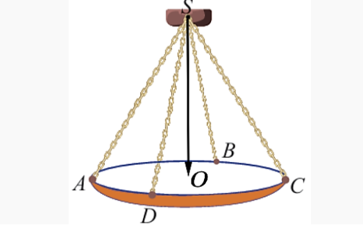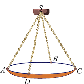 Một chiếc đèn chùm treo có khối lượng $m=5$ kg được thiết kế với đĩa đèn được giữ bởi bốn đoạn xích $SA, SB, SC, SD$ sao cho $S.ABCD$ là hình chóp tứ giác đều có $\widehat{ASC}=60^\circ$ (Hình 21).