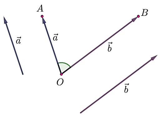 Cho hai vectơ $\vec{a}$ và $\vec{b}$ khác vectơ-không. Từ một điểm $O$ bất kỳ ta vẽ $\vec{OA} = \vec{a}$ và $\vec{OB} = \vec{b}$. Khi đó góc $\widehat{AOB}$ với số đo từ $0^\circ$ đến $180^\circ$ được gọi là góc giữa hai vectơ $\vec{a}$ và $\vec{b}$ và ký hiệu là $(\vec{a}, \vec{b})$.