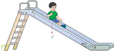 Một em nhỏ cân nặng $m=25$ kg trượt trên cầu trượt dài 3,5 m. Biết rằng, cầu trượt có góc nghiêng so với phương nằm ngang là 30$^\circ$.