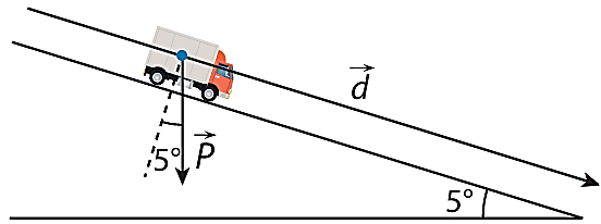 Vectơ $\vec{d}$ biểu thị độ dịch chuyển của xe có độ dài là $|\vec{d}| = 30$ m, và góc $(\vec{P}, \vec{d}) = 90^\circ - 5^\circ = 85^\circ$.