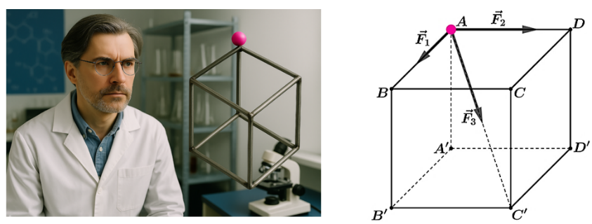 Trong phòng thí nghiệm vật lý, một chất điểm đặt ở vị trí A của hình lập phương được tác động bởi ba lực $\vec{F}_1, \vec{F}_2, \vec{F}_3$ dọc theo hai cạnh và đường chéo lớn của hình lập phương đó (tham khảo hình vẽ). Biết độ lớn các lực trên hai cạnh bằng 2 N và 3 N, độ lớn lực dọc theo đường chéo lớn lập phương bằng 4 N. Tính độ lớn hợp lực $\vec{F}_1+\vec{F}_2+\vec{F}_3$ theo đơn vị N, làm tròn đến hàng phần trăm.