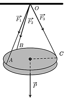 Một chiếc đèn tròn được treo song song với mặt phẳng nằm ngang bởi ba sợi dây không dãn xuất phát từ điểm $O$ trên trần nhà và lần lượt buộc vào ba điểm $A, B, C$ trên đèn tròn sao cho các lực căng $\vec{F}_1, \vec{F}_2, \vec{F}_3$ lần lượt trên mỗi dây $OA, OB, OC$ đôi một vuông góc với nhau và $|\vec{F}_1|=|\vec{F}_2|=|\vec{F}_3|=15$ (N). Tính trọng lượng của chiếc đèn đó.