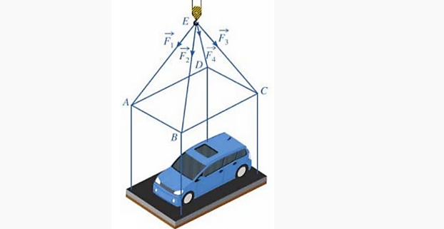 Tính trọng lượng của chiếc xe ô tô (làm tròn đến hàng đơn vị của N), biết rằng các lực căng $\vec{F}_1, \vec{F}_2, \vec{F}_3, \vec{F}_4$ đều có cường độ là 4700 N và trọng lượng của khung sắt là 3000 N.