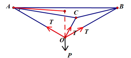 Question 105. (THPT Triệu Sơn 3 - Thanh Hóa 2025) Một chiếc đèn trang trí (gồm các bóng đèn gắn vào một giá hình tròn) như hình bên dưới. Đèn được treo song song với mặt phẳng nằm ngang bởi ba sợi dây không dãn xuất phát từ điểm $O$ trên trần nhà và lần lượt buộc vào ba điểm $A, B, C$ trên giá sao cho tam giác $ABC$ đều. Độ dài của ba đoạn dây $OA,OB,OC$ đều bằng $L$, trọng lượng của chiếc đèn là 27N, bán kính của giá hình tròn là 0,5m. Biết rằng mỗi sợi dây đó được thiết kế để chịu được lực căng tối đa là 12N. Hỏi chiều dài tối thiểu của mỗi sợi dây là bao nhiêu mét? (kết quả làm tròn đến hàng phần trăm).