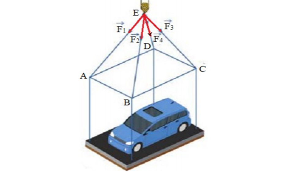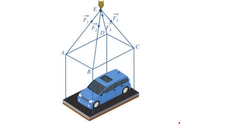 Question 104. (THPT Thạch Thành 1 - Thanh Hóa 2025) Một chiếc ô tô được đặt trên mặt đáy dưới một khung sắt có dạng hình hộp chữ nhật với đáy trên là hình vuông $ABCD$, mặt phẳng $(ABCD)$ song song với mặt mặt phẳng nằm ngang. Khung sắt đó được buộc vào móc $E$ của chiến cần cẩu sao cho các đoạn dây cáp $EA, EB, EC, ED$ có độ dài bằng nhau và cùng tạo với mặt phẳng $(ABCD)$ một góc 45° như hình vẽ. Chiếc cần cẩu kéo khung sắt lên theo phương thẳng đứng. Biết lực căng $|\vec{F_1}|=|\vec{F_2}|=|\vec{F_3}|=|\vec{F_4}|$, trọng lượng khung sắt là 1000(N) và trọng lượng của chiếc xe ô tô là 4000(N). Tính cường độ lực căng của mỗi đoạn dây cáp. (làm tròn đến hàng đơn vị)