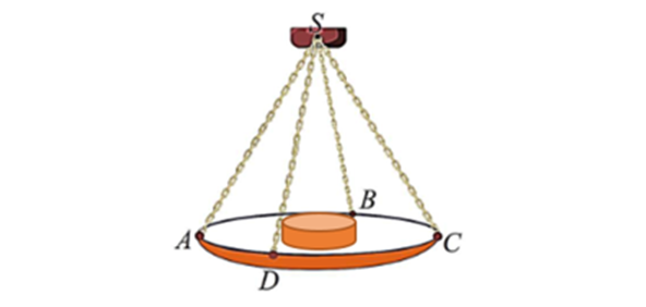 Question 109. (THPT Trần Nguyên Hãn - Hải Phòng 2025) Một chiếc cân đòn tay đang cân một vật có khối lượng $m = 3\,\text{kg}$ được thiết kế với đĩa cân được giữ bởi bốn đoạn xích $SA, SB, SC, SD$ sao cho $S.ABCD$ là hình chóp tứ giác đều có $\widehat{ASC} = 90^\circ$. Biết độ lớn của lực căng mỗi sợi xích có dạng $\dfrac{a\sqrt{2}}{4}$(N). Biết trọng lượng của vật nặng được tính theo công thức $P = mg$, lấy $g = 10\,\text{m/s}^2$. Khi đó giá trị của $a$ bằng bao nhiêu?